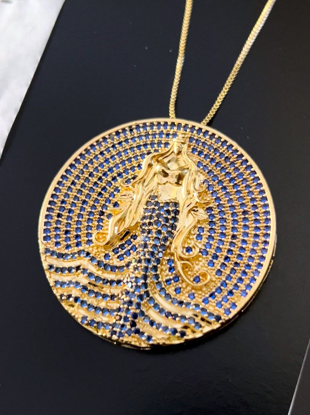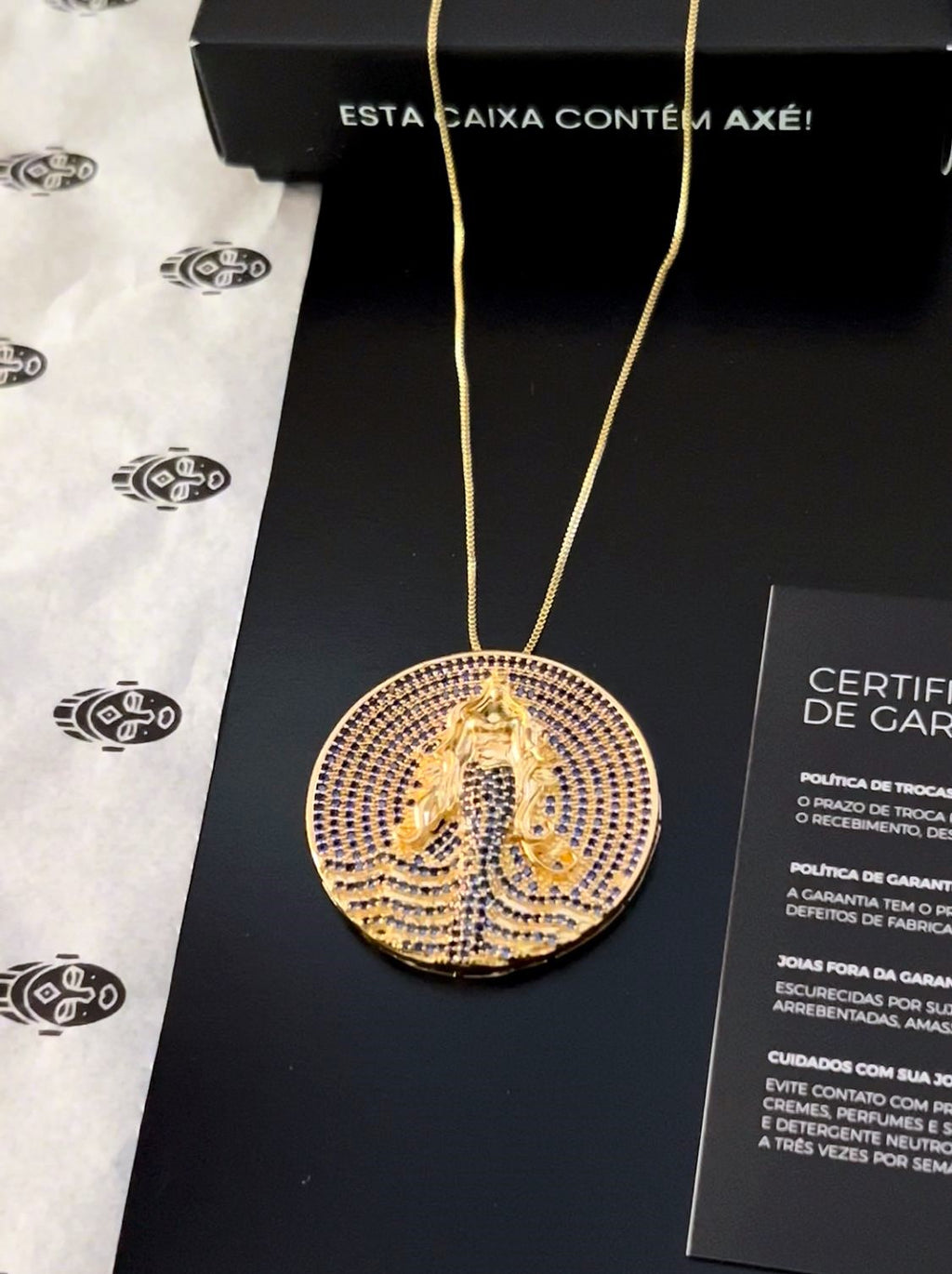Kit Pingente Mandala Grande Iemanjá Banhada A Ouro 18k e Cravejada Com Micro Zircônias Azul + Corrente Veneziana 60cm